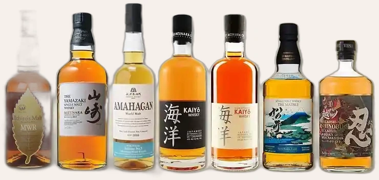 Dưới đây là một số loại whisky đã được ủ hoàn toàn hoặc một phần trong thùng gỗ sồi Mizunara:
