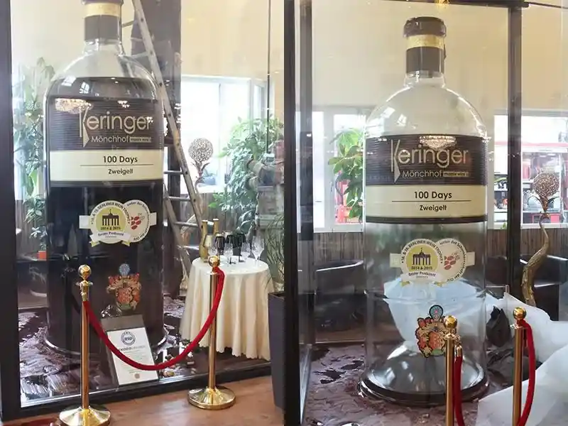 Chai này được sản xuất vào năm 2016 để trưng bày tại nhà hàng Trung Quốc Engel Wang Fu ở thị trấn Lustena của Áo và được đổ đầy với loại rượu vang đỏ năm 2015 của nhà sản xuất rượu Áo là Keringer.
