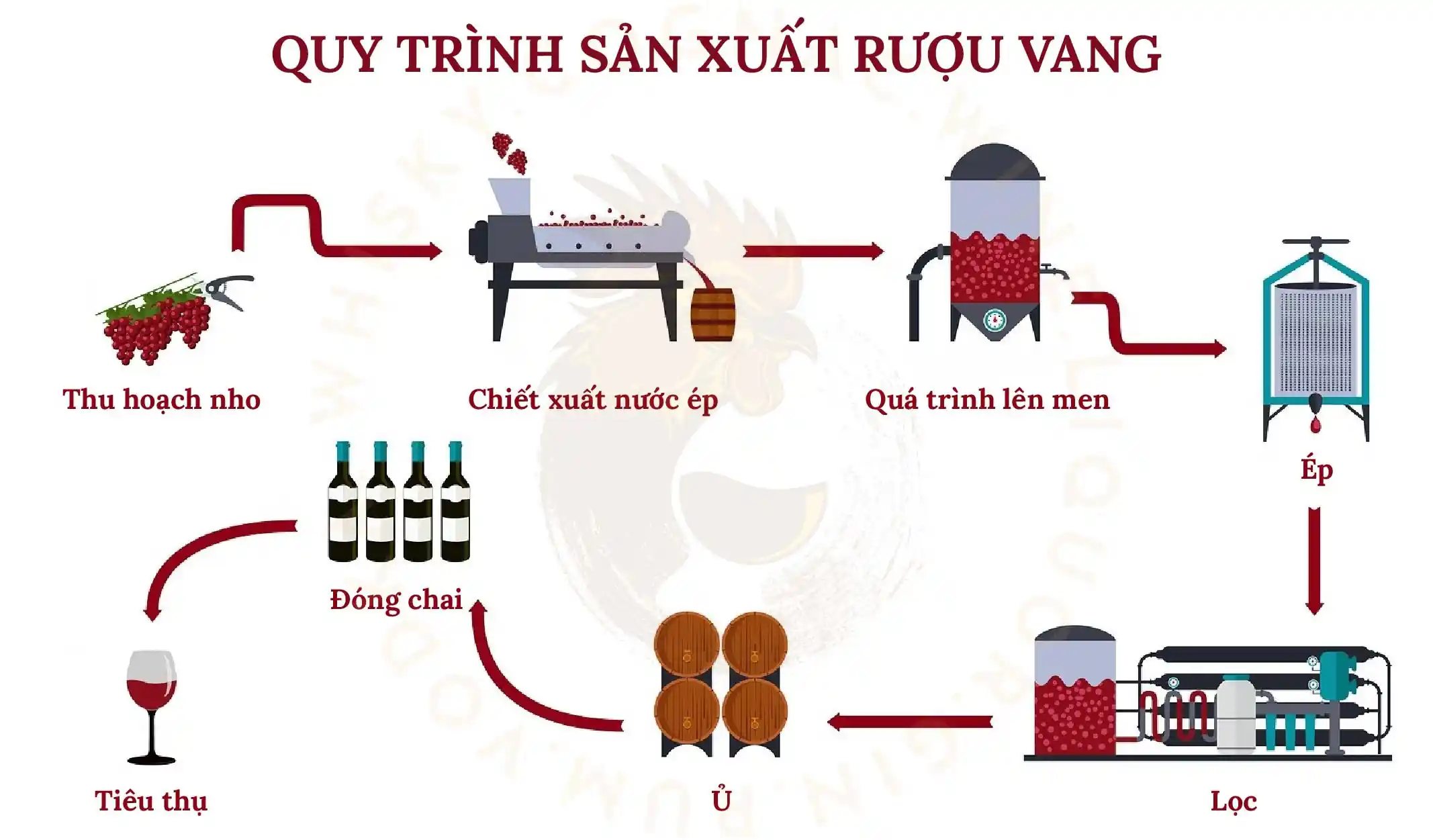 Quá trình sản xuất rượu vang bắt đầu bằng việc trồng nho. Vì nho chứa nhiều glucose, thúc đẩy quá trình lên men rượu, nên rượu vang được chuyển hóa tự nhiên thành rượu mà không cần bất kỳ quá trình xử lý đặc biệt nào.