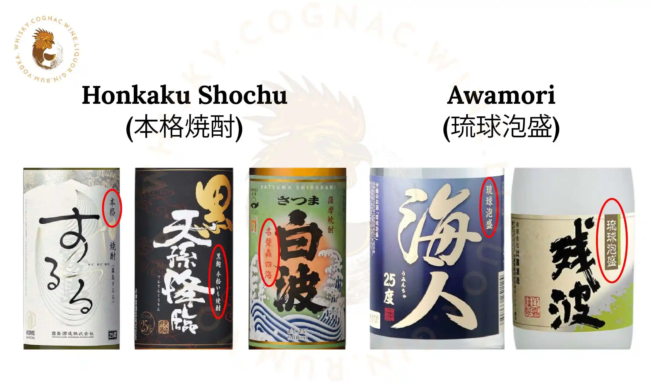 Cả hai loại này đều được phân loại là otsu-rui shochu hoặc shochu loại Otsu, đây là một loại shochu cao cấp được làm bằng phương pháp chưng cất đơn. Nhờ phương pháp này, hương vị của các nguyên liệu trong otsu-rui shochu sẽ được giữ lại, mang đến hương thơm và vị ngon vượt trội.