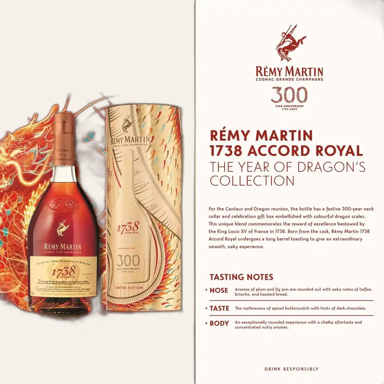 Vào 1724, năm Giáp Thìn, Nhà sản xuất Rémy Martin được thành lập tại phía Tây nước Pháp, lấy hiện thân là biểu tượng Nhân Mã trong thần thoại. 300 năm trước chính là cuộc gặp gỡ đầu tiên của hai sinh vật thần thoại: Nhân Mã của phương Tây và Rồng ở phương Đông.Sau 3 thế kỷ, hai biểu tượng này một lần nữa tái hợp với nhau.