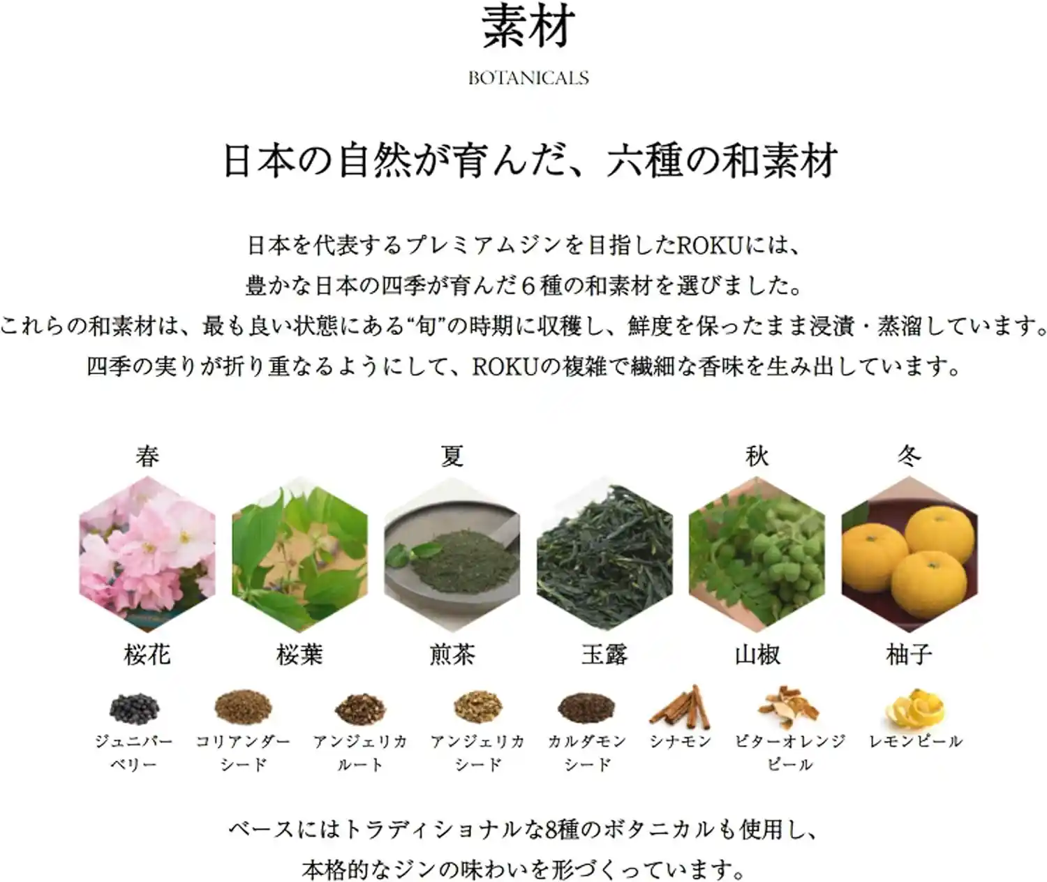 Được sản xuất từ 14 loại nguyên liệu khác nhau nhưng trong đó tập trung vào 6 loại nguyên liệu được trồng và thu hoạch tại Nhật Bản vào các thời điểm khác nhau trong năm: Hoa anh đào, lá cây hoa anh đào, vỏ Yuzu, trà Sencha, trà Gyokuro, tiêu Sansho. Mỗi loại nguyên liệu được thu hoạch vào đúng thời điểm vàng của mỗi vụ để có thể lưu giữ được hương vị tốt nhất của từng loại nguyên liệu. Tám loại nguyên liệu khác được thêm vào để làm tăng thêm hương vị rượu Gin đích thực bao gồm: Quả bách xù, rau mùi, hạt và rễ cây bạch chỉ, quế, bạch đậu khấu, cam đắng, vỏ chanh.