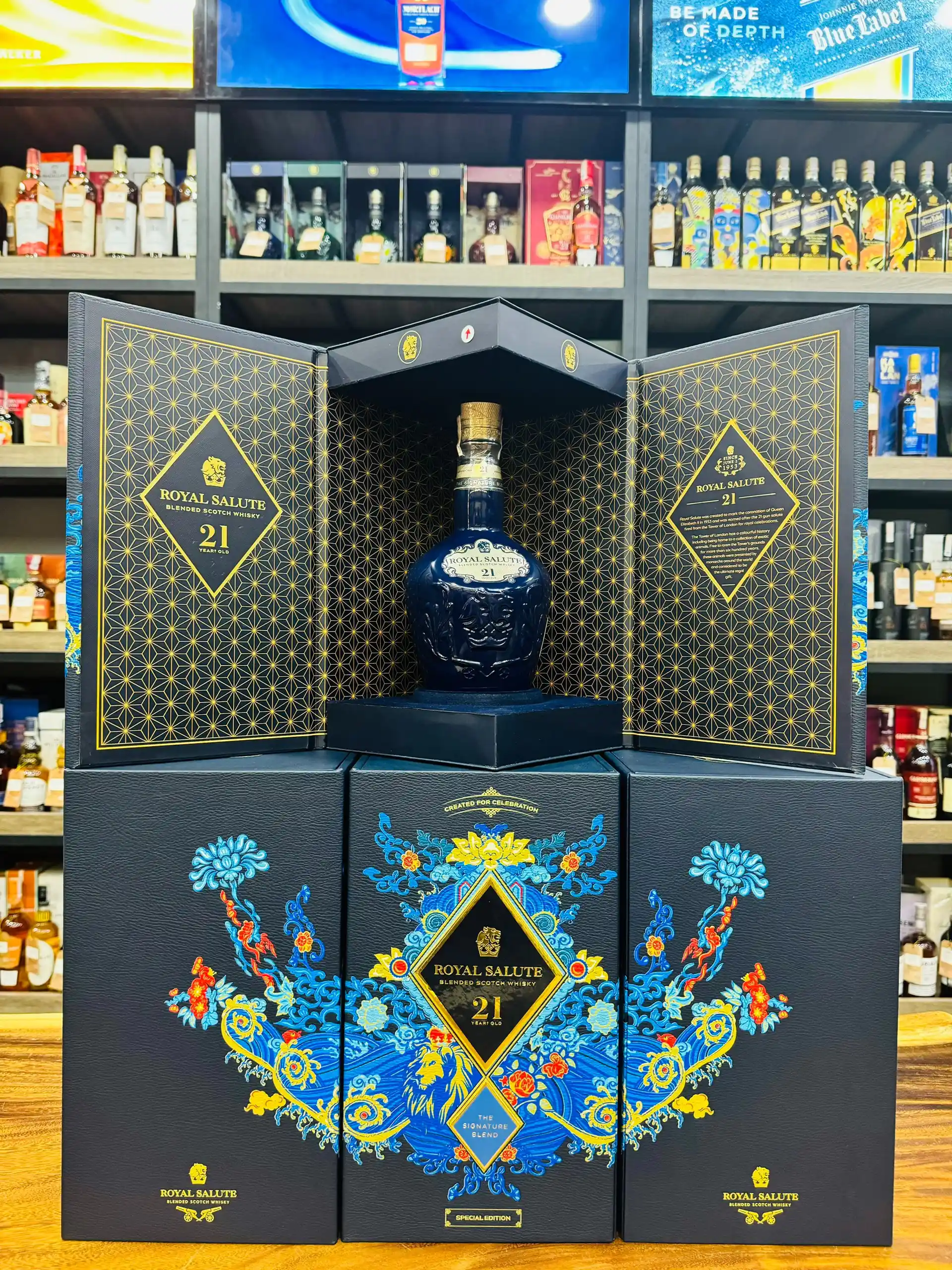 Tuyệt tác mừng tân xuân này còn có một cách gọi khác, quen thuộc hơn là Chivas 21 phiên bản Tết 2024 thuộc nhà Royal Salute. Tết là dịp mà nhà Royal Salute hay đổi áo cho sản phẩm nhiều nhất, nếu năm 2023 là màu đỏ sang trọng gắn liền với Tết thì Tết năm 2024 sẽ là màu xanh đậm mát mắt với họa tiết hoa tinh xảo.